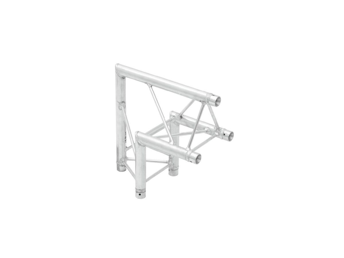 ALUTRUSS DECOLOCK DQ3-PAC24 2-Way Corner 90° – 3 pontos traverz rendszer sarokelem DECOLOCK DQ3 hárompontos traverz fényhíd rendszer A DECOLOCK DQ3 egy 3 pontos traverz fényhíd rendszer alumíniumból. Az egyes elemek három kúpon, csatlakozókon és csatlakozókon keresztül vannak összekötve. A kúpos összekötő elem csatlakozási rendszer előnye, hogy a kúpos összekötő elem összekötő elemek teljesen illeszkednek a fő merevítő okhoz, így garantálva a legnagyobb terhelhetőséget. A Quick-Lock rendszer gyors, hatékony és esztétikus összeszerelést tesz lehetővé, amikor a traverz tartó szerkezeteket gyakran összeszerelik és szétszerelik. A három fő merevítő 35 mm-es, 2 mm-es falvastagságú alumíniumcsőből készül, és kellő szilárdságot kínál kis súly mellett. A merevítők átmérője 10 mm, 2 mm falvastagsága, és dekoratív megjelenést kölcsönöznek a rendszernek. A DECOLOCK segítségével kompakt felszereléseket valósíthat meg, alacsony önsúlyú, pl. g. üzleti kiállításokhoz, üzleti dekorációkhoz, kiállításokhoz, belsőépítészethez, csarnokokhoz , diszkókhoz és színházakhoz. A Decolock elsősorban dekorációs installációkhoz készült, és rendkívül esztétikus megjelenése miatt fix vagy ideiglenes installációkhoz használható. Ennek a rendszernek az előnyei a kompakt felépítés, 220 és 195 mm külső méretekkel, alacsony tömeggel, optimális szilárdsággal, valamint egyszerű és gyors összeszereléssel. A traverz fényhíd rendszer dokumentációja szorosan kapcsolódik az SQ P1 – traverz fényhíd rendszer ek gyakorlati kódexéhez. a VPLT / PLASA. A terhelési táblázat mint számítási foglalat letölthető az internetről a termék megvásárlása előtt! Kérjük, vegye figyelembe: ezt a traverz fényhíd rendszer t soha nem szabad kombinálni más rendszerekkel!