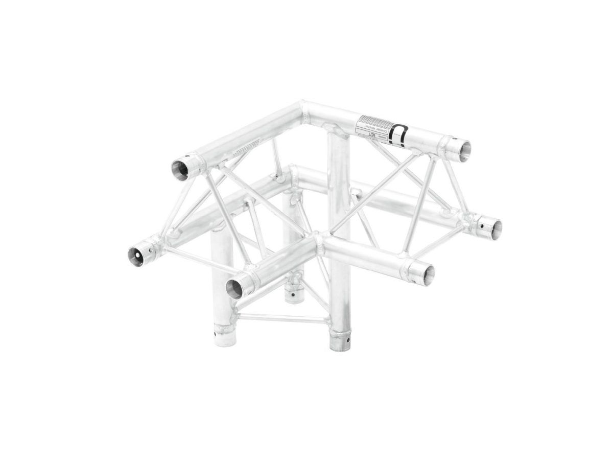 ALUTRUSS DECOLOCK DQ3-PAL32 3-Way Corner 90° – 3 pontos traverz rendszer sarokelem DECOLOCK DQ3 hárompontos traverz fényhíd rendszer A DECOLOCK DQ3 egy 3 pontos traverz fényhíd rendszer alumíniumból. Az egyes elemek három kúpon, csatlakozókon és csatlakozókon keresztül vannak összekötve. A kúpos összekötő elem csatlakozási rendszer előnye, hogy a kúpos összekötő elem összekötő elemek teljesen illeszkednek a fő merevítő okhoz, így garantálva a legnagyobb terhelhetőséget. A Quick-Lock rendszer gyors, hatékony és esztétikus összeszerelést tesz lehetővé, amikor a traverz tartó szerkezeteket gyakran összeszerelik és szétszerelik. A három fő merevítő 35 mm-es, 2 mm-es falvastagságú alumíniumcsőből készül, és kellő szilárdságot kínál kis súly mellett. A merevítők átmérője 10 mm, 2 mm falvastagsága, és dekoratív megjelenést kölcsönöznek a rendszernek. A DECOLOCK segítségével kompakt felszereléseket valósíthat meg, alacsony önsúlyú, pl. g. üzleti kiállításokhoz, üzleti dekorációkhoz, kiállításokhoz, belsőépítészethez, csarnokokhoz , diszkókhoz és színházakhoz. A Decolock elsősorban dekorációs installációkhoz készült, és rendkívül esztétikus megjelenése miatt fix vagy ideiglenes installációkhoz használható. Ennek a rendszernek az előnyei a kompakt felépítés, 220 és 195 mm külső méretekkel, alacsony tömeggel, optimális szilárdsággal, valamint egyszerű és gyors összeszereléssel. A traverz fényhíd rendszer dokumentációja szorosan kapcsolódik az SQ P1 – traverz fényhíd rendszer ek gyakorlati kódexéhez. a VPLT / PLASA. A terhelési táblázat mint számítási foglalat letölthető az internetről a termék megvásárlása előtt! Kérjük, vegye figyelembe: ezt a traverz fényhíd rendszer t soha nem szabad kombinálni más rendszerekkel!