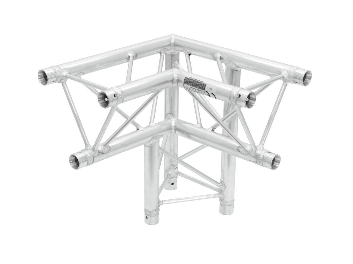 ALUTRUSS DECOLOCK DQ3-PAL33 3-Way Corner 90° – 3 pontos traverz rendszer sarokelem DECOLOCK DQ3 hárompontos traverz fényhíd rendszer A DECOLOCK DQ3 egy 3 pontos traverz fényhíd rendszer alumíniumból. Az egyes elemek három kúpon, csatlakozókon és csatlakozókon keresztül vannak összekötve. A kúpos összekötő elem csatlakozási rendszer előnye, hogy a kúpos összekötő elem összekötő elemek teljesen illeszkednek a fő merevítő okhoz, így garantálva a legnagyobb terhelhetőséget. A Quick-Lock rendszer gyors, hatékony és esztétikus összeszerelést tesz lehetővé, amikor a traverz tartó szerkezeteket gyakran összeszerelik és szétszerelik. A három fő merevítő 35 mm-es, 2 mm-es falvastagságú alumíniumcsőből készül, és kellő szilárdságot kínál kis súly mellett. A merevítők átmérője 10 mm, 2 mm falvastagsága, és dekoratív megjelenést kölcsönöznek a rendszernek. A DECOLOCK segítségével kompakt felszereléseket valósíthat meg, alacsony önsúlyú, pl. g. üzleti kiállításokhoz, üzleti dekorációkhoz, kiállításokhoz, belsőépítészethez, csarnokokhoz , diszkókhoz és színházakhoz. A Decolock elsősorban dekorációs installációkhoz készült, és rendkívül esztétikus megjelenése miatt fix vagy ideiglenes installációkhoz használható. Ennek a rendszernek az előnyei a kompakt felépítés, 220 és 195 mm külső méretekkel, alacsony tömeggel, optimális szilárdsággal, valamint egyszerű és gyors összeszereléssel. A traverz fényhíd rendszer dokumentációja szorosan kapcsolódik az SQ P1 – traverz fényhíd rendszer ek gyakorlati kódexéhez. a VPLT / PLASA. A terhelési táblázat mint számítási foglalat letölthető az internetről a termék megvásárlása előtt! Kérjük, vegye figyelembe: ezt a traverz fényhíd rendszer t soha nem szabad kombinálni más rendszerekkel!