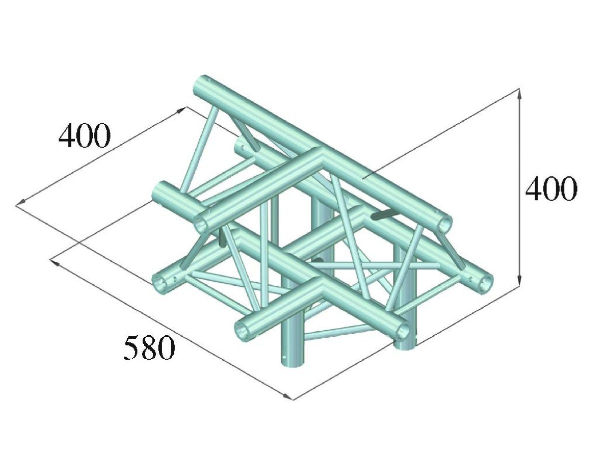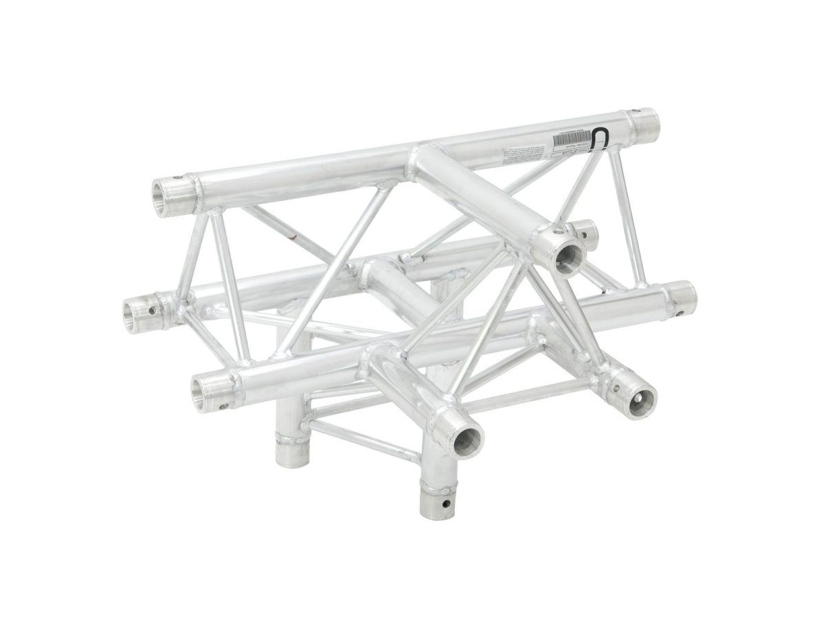 ALUTRUSS DECOLOCK DQ3-PAT43 4-Way T-Piece – 3 pontos traverz rendszer T alakú elem DECOLOCK DQ3 hárompontos traverz fényhíd rendszer A DECOLOCK DQ3 egy 3 pontos traverz fényhíd rendszer alumíniumból. Az egyes elemek három kúpon, csatlakozókon és csatlakozókon keresztül vannak összekötve. A kúpos összekötő elem csatlakozási rendszer előnye, hogy a kúpos összekötő elem összekötő elemek teljesen illeszkednek a fő merevítő okhoz, így garantálva a legnagyobb terhelhetőséget. A Quick-Lock rendszer gyors, hatékony és esztétikus összeszerelést tesz lehetővé, amikor a traverz tartó szerkezeteket gyakran összeszerelik és szétszerelik. A három fő merevítő 35 mm-es, 2 mm-es falvastagságú alumíniumcsőből készül, és kellő szilárdságot kínál kis súly mellett. A merevítők átmérője 10 mm, 2 mm falvastagsága, és dekoratív megjelenést kölcsönöznek a rendszernek. A DECOLOCK segítségével kompakt felszereléseket valósíthat meg, alacsony önsúlyú, pl. g. üzleti kiállításokhoz, üzleti dekorációkhoz, kiállításokhoz, belsőépítészethez, csarnokokhoz , diszkókhoz és színházakhoz. A Decolock elsősorban dekorációs installációkhoz készült, és rendkívül esztétikus megjelenése miatt fix vagy ideiglenes installációkhoz használható. Ennek a rendszernek az előnyei a kompakt felépítés, 220 és 195 mm külső méretekkel, alacsony tömeggel, optimális szilárdsággal, valamint egyszerű és gyors összeszereléssel. A traverz fényhíd rendszer dokumentációja szorosan kapcsolódik az SQ P1 – traverz fényhíd rendszer ek gyakorlati kódexéhez. a VPLT / PLASA. A terhelési táblázat mint számítási foglalat letölthető az internetről a termék megvásárlása előtt! Kérjük, vegye figyelembe: ezt a traverz fényhíd rendszer t soha nem szabad kombinálni más rendszerekkel!