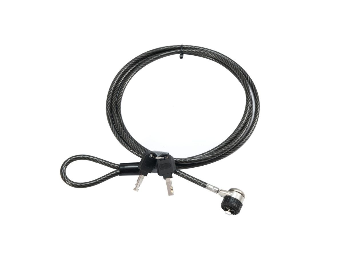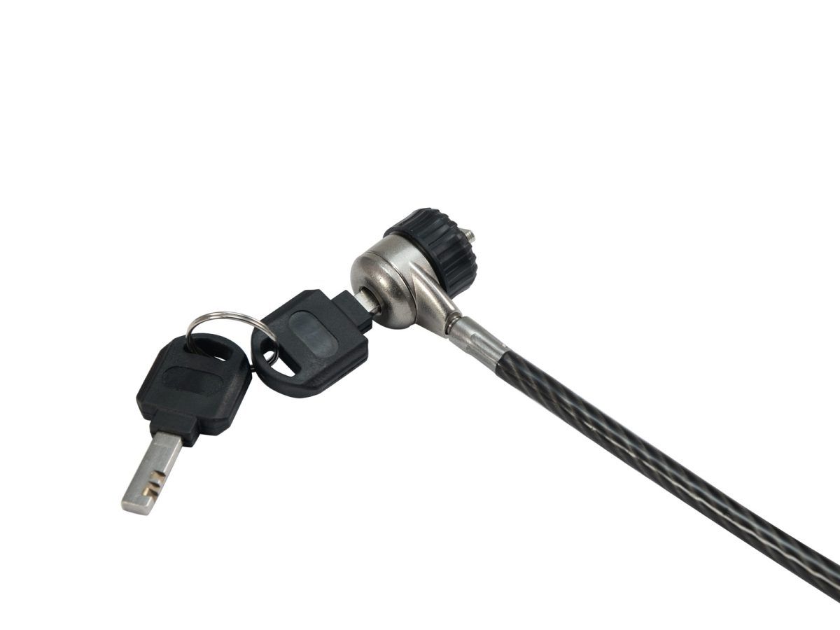 EUROLITE KG-180S Cable Lock Anti-theft Protection with Key – Kábelzár lopásgátló védelem kulccsal Ezzel a kábelzárral különféle eszközöket, például notebookokat, projektorokat, képernyőket és akkumulátorral működtetett eszközöket rögzíthet. Az 1,80 m-es műanyag bevonattal ellátott acélkábelt könnyen meg lehet kötni olyan tárgyak körül, mint a traverz tartó és hasonlók, hogy megvédje készülékét a lopás ellen.