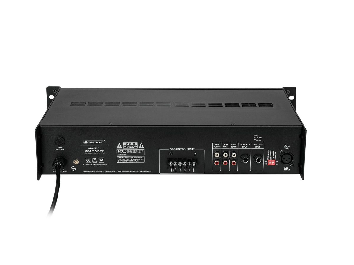 | Csatlakozások: | Bemenet: Mikrofon 2 x 6,3 mm-es csatlakozón keresztül (unbal.) Bemenet: Mikrofon 1 x 3 Pin XLR-en keresztül Bemenet: vonali 3 x sztereó RCA 0,3 V Kimenet: vonal 1 x sztereó RCA 0,3 V-on keresztül Kimenet: hangszóró csavaros csatlakozón keresztül |