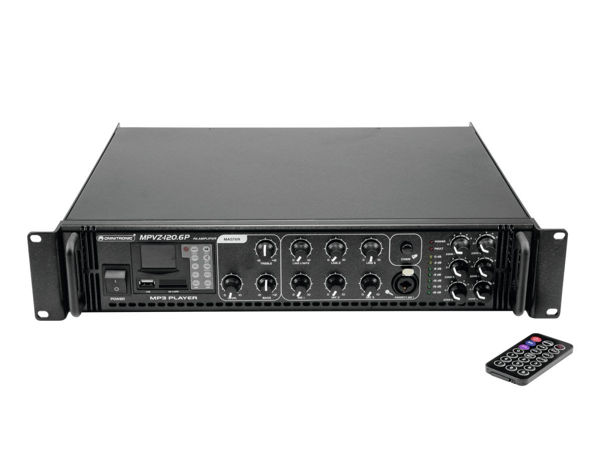 6 zónás PA monokeverő erősítő, MP3-lejátszó & IR távirányító, zónaváltó, 120 watt