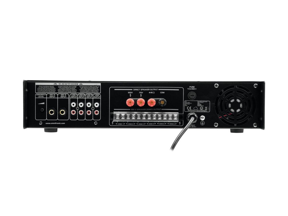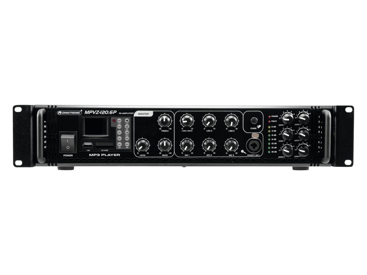 OMNITRONIC MPVZ-120.6P PA Mixing Amp 6 zónás PA mono keverő erősítő 120W, MP3 lejátszóval és távirányítóval Óriási megbízhatóság és maximális sokoldalúság Az Omnitronic MPVZ-120.6P ELA keverőerősítő az Ön megbízható partnere az ELA hangerősítő rendszerekben. 19 “formátumának köszönhetően ideális mind mobil, mind fix telepítésekhez. Az ELA hangszórók kimenetei 70 V és 100 V hangtranszformátorokkal vagy 4-16 Ohm hangszórókkal nem hagynak kívánnivalót maga után. Ezenkívül csatlakoztathat egy eszköz vonali (pl. keverőpult) a vonalkimenethez. Mindig rugalmas, 6 keverhető bemenettel. Csatlakoztasson akár 3 mikrofont és 3 vonali eszközt. Kényelmesen vezérelheti ELA hangszóróit az MPVZ-120.6P 6 zónás kimenetén keresztül . Az előlapon külön-külön állíthatók, 5 fokozatú hangerőszabályzóval. Számodra ez a lehető legnagyobb alkalmazkodóképességet jelenti a hangerősítési koncepció megvalósításakor. Az MPZ-120.6P infravörös távirányítóval és kékkel ellátott MP3-lejátszót is kínál háttérvilágítású LCD kijelző. SD kártyanyílásával és USB portjával egyaránt rendelkezik. Így spontán és rugalmasan játszhat zenei címeket az Ön által választott adathordozón. Hallassa magát! Az előlapon található 3 mikrofonbemenet állítható p riority kapcsoló. Fontos beszédeket tesz lehetővé az összes jel automatikus, folyamatosan állítható szintcsökkentésével. Használja a gongot, hogy további figyelmet fordítson bejelentésére. Ventilátor védi az MPVZ-120.6P belsejét a túlmelegedéstől. A bekapcsolási késleltetésen túl védelmi áramkörökkel rendelkezik a túlfeszültség és a rövidzárlat ellen. Ezekben az esetekben a hangszórók elektromosan vannak elválasztva az erősítőtől. Ez megvédi az MPVZ-120.6P-t és a hangszórókat is a sérülésektől.