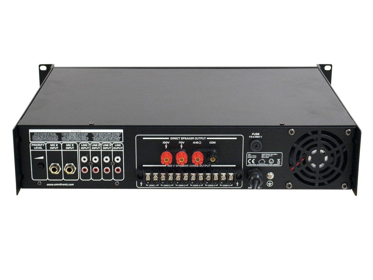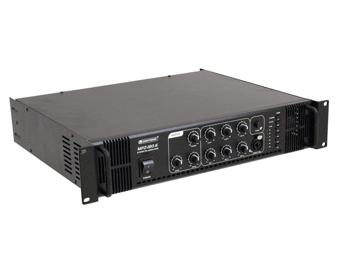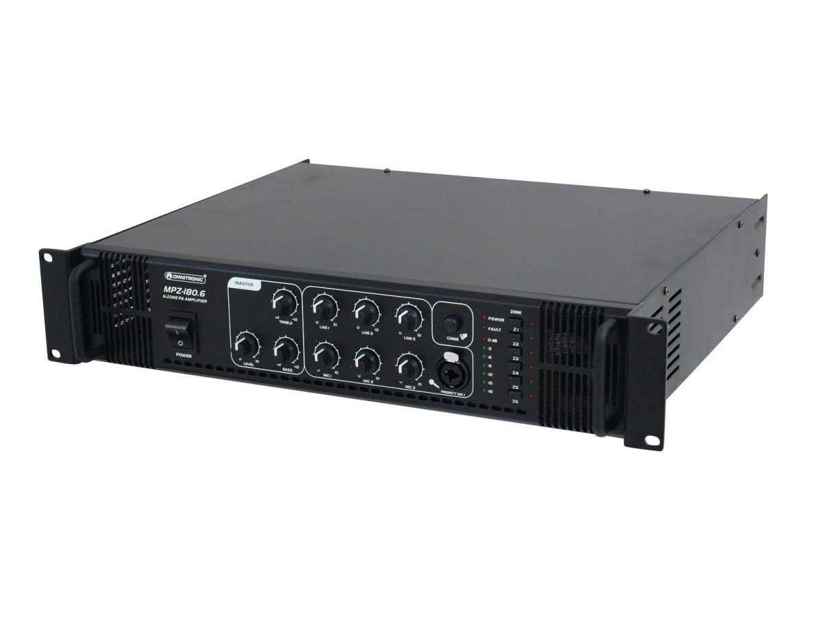OMNITRONIC MPZ-180.6 PA Mixing Amplifier 6 zónás PA mono keverő erősítő 180W Óriási megbízhatóság és maximális sokoldalúság Az Omnitronic MPZ-180.6 ELA keverőerősítő az Ön megbízható partnere az ELA hangerősítő rendszerekben. 19 “formátumának köszönhetően ideális mind mobil, mind fix telepítésekhez. Az ELA hangszórók kimenetei 70 V és 100 V hangtranszformátorokkal vagy 4-16 Ohm hangszórókkal nem hagynak kívánni valót. Ezenkívül csatlakoztathat egy vonali eszköz (pl. keverőpult) a vonalkimenethez. 6 keverhető bemenettel Ön mindig rugalmas. Csatlakoztasson akár 3 mikrofont és 3 vonali eszközt. Kényelmesen irányíthatja ELA hangszóróit az MPZ-180.6 6 zónás kimenetén keresztül . Az előlapon külön kapcsolhatók. Számodra ez a lehető legnagyobb alkalmazkodóképességet jelenti a hangerősítési koncepció megvalósításakor. Hallgasd meg magad! Az front mikrofon bemeneten állítható prioritású kapcsoló található. Ez lehetővé teszi, hogy fontos beszédeket tegyen az összes jel automatikus, folyamatosan állítható szintcsökkentésével. Használhatja a gongot is, hogy felhívja a figyelmet a bejelentésére. Védelmi funkciók A ventilátor megvédi az MPZ-180.6 belsejét a túlmelegedés. A bekapcsolási késleltetésen túl védelmi áramkörökkel rendelkezik a túlfeszültség és a rövidzárlat ellen. Ezekben az esetekben a hangszórók elektromosan vannak elválasztva az erősítőtől. Ez megvédi az MPZ-180.6-ot és a hangszórókat is a sérülésektől.