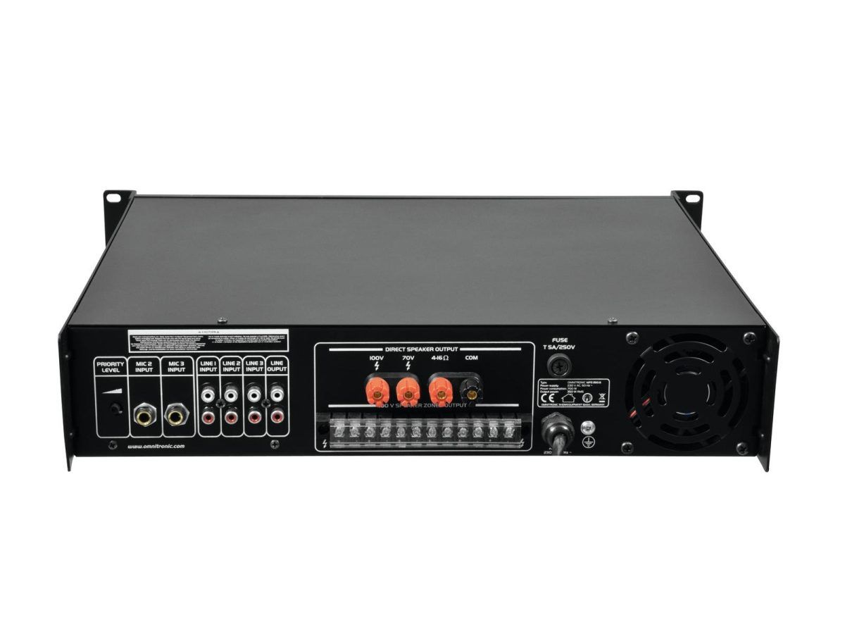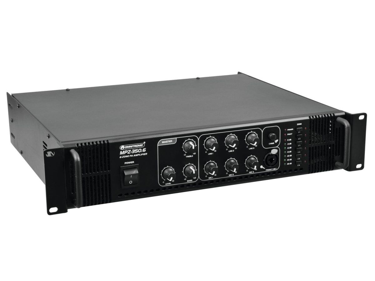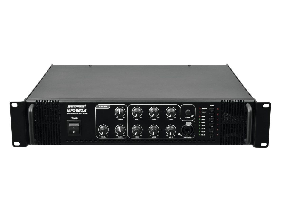 OMNITRONIC MPZ-350.6 PA Mixing Amplifier 6 zónás PA mono keverő erősítő 350W Óriási megbízhatóság és maximális sokoldalúság Az Omnitronic MPZ-350.6 ELA keverőerősítő az Ön megbízható partnere az ELA hangerősítő rendszerekben. 19 “formátumának köszönhetően ideális mind mobil, mind fix telepítésekhez. Az ELA hangszórók kimenetei 70 V és 100 V hangtranszformátorokkal vagy 4-16 Ohm hangszórókkal nem hagynak kívánnivalót maga után. Ezenkívül csatlakoztathat egy vonali eszköz (pl. keverőpult) a vonalkimenethez. 6 keverhető bemenettel Ön mindig rugalmas. Csatlakoztasson akár 3 mikrofont és 3 vonali eszközt. Kényelmesen irányíthatja ELA hangszóróit az MPZ-350.6 6 zónás kimenetén . Külön lehet őket kapcsolni az előlapon. Számodra ez a lehető legnagyobb alkalmazkodóképességet jelenti a hangerősítési koncepció megvalósításakor. Hallgasd meg magad! Az front mikrofon bemeneten állítható prioritású kapcsoló található. Ez lehetővé teszi, hogy fontos beszédeket tegyen az összes jel automatikus, folyamatosan állítható szintcsökkentésével. A gong segítségével felhívhatja a figyelmet a bejelentésére. Védelmi funkciók Egy ventilátor védi az MPZ-350.6 belsejét a túlmelegedés. A bekapcsolási késleltetésen túl védelmi áramkörökkel rendelkezik a túlfeszültség és a rövidzárlat ellen. Ezekben az esetekben a hangszórók elektromosan vannak elválasztva az erősítőtől. Ez megvédi az MPZ-350.6-at és a hangszórókat is a sérüléstől.