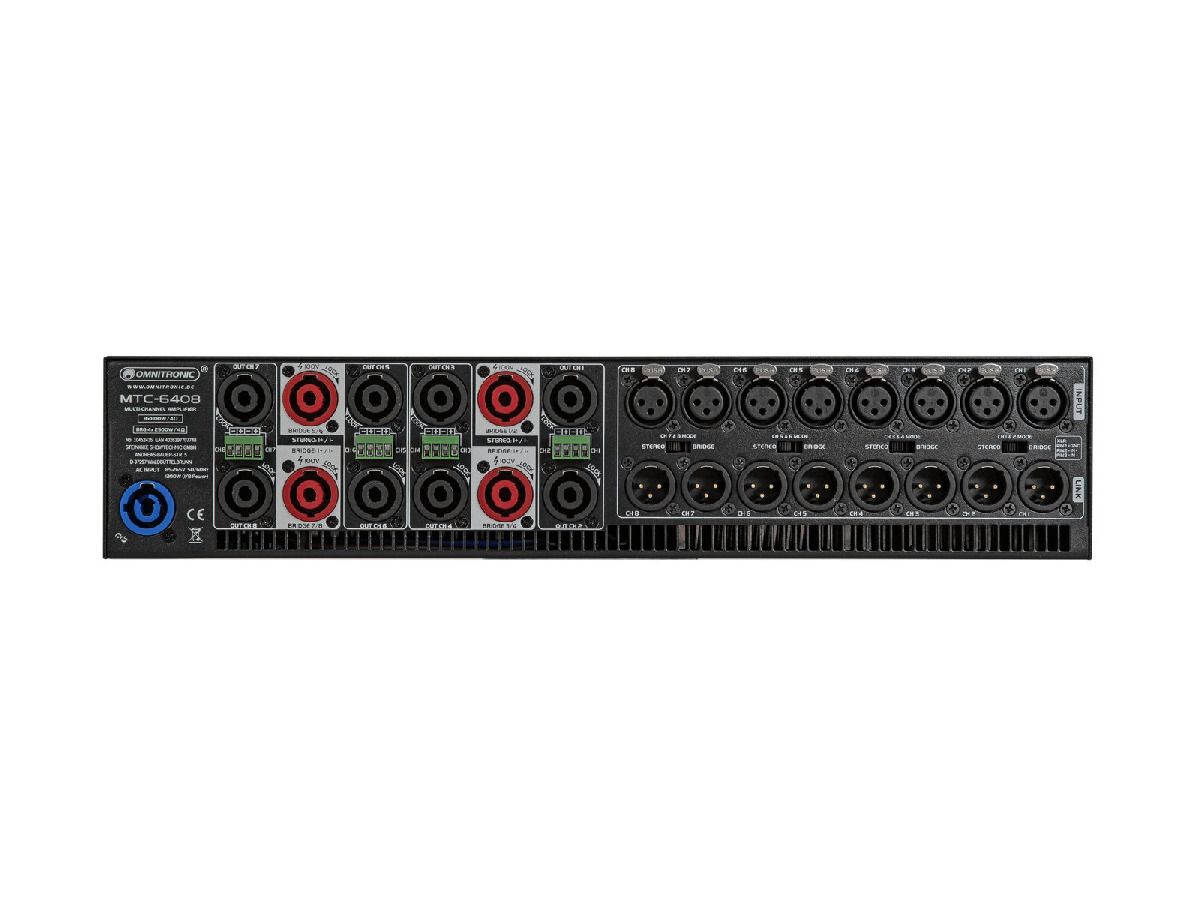 | Csatlakozások : | Bemenet: vonal 8 x 3 Pin XLR-en keresztül Link: vonal 8 x 3 Pin XLR-en keresztül Kimenet: hangszóró csavaros csatlakozón keresztül Kimenet: 8 x hangszóró beépített foglalat (F) Kimenet: Hangszóró (híd) 4 x hangszóró beépített foglalaton keresztül (F) |
