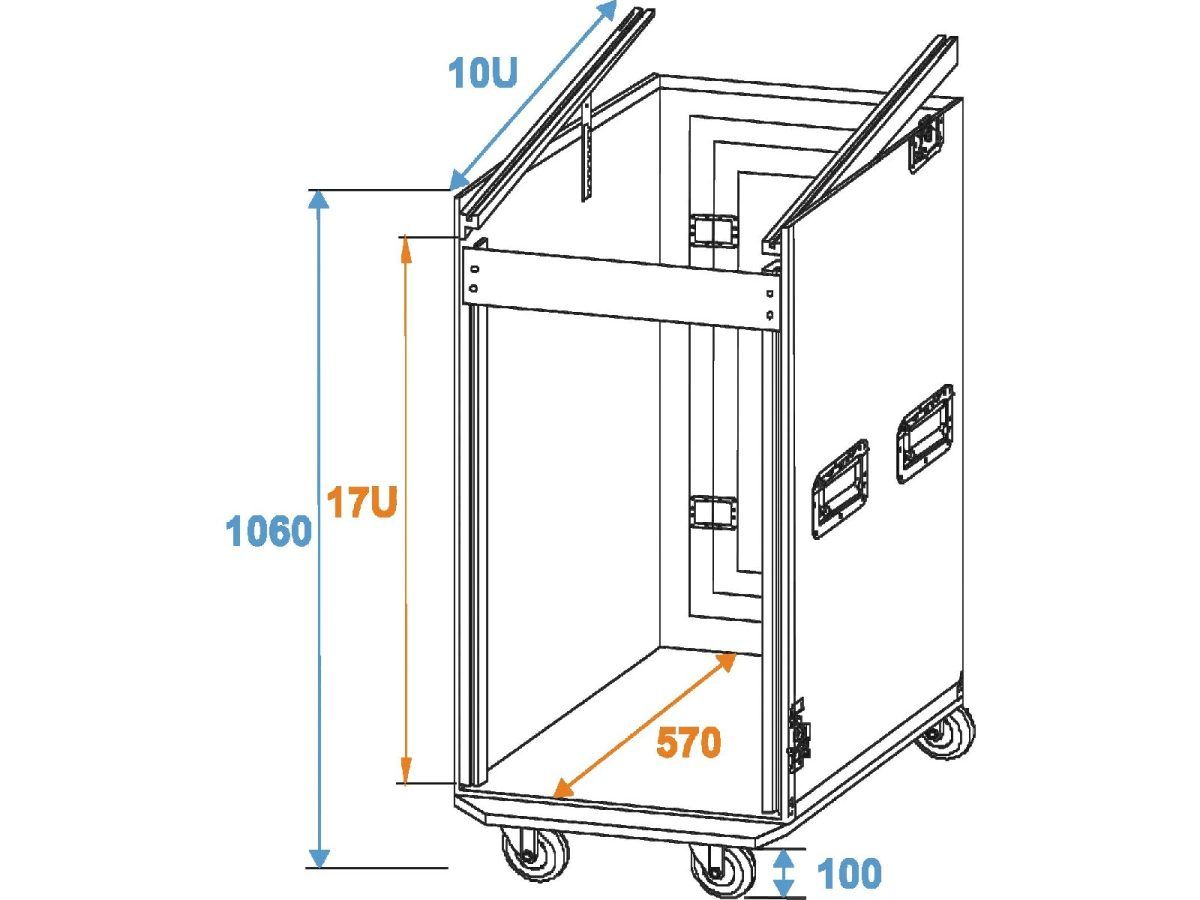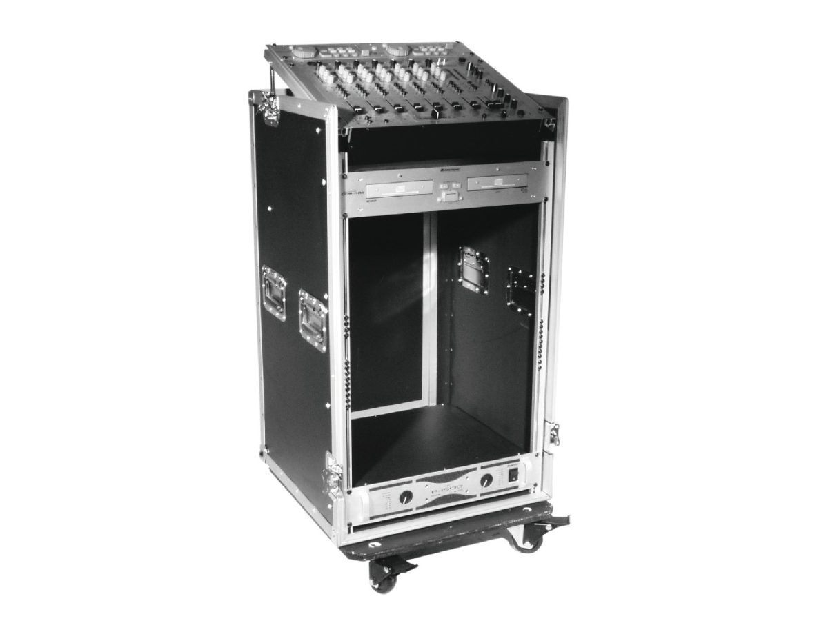 • Professional solution for a complete DJ setput; this heavy-duty case accommodates your PA, a double CD player, a 483 mm mixer (19″), effect units, and further 483 mm units (19″)