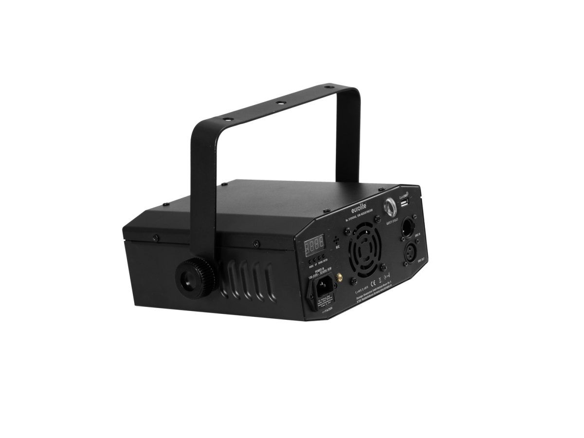 | Vezérlés: | DMX; IR távirányító; QuickDMX USB-n keresztül (opcionális); Master / slave funkció; Fénymozgás ritmusra a mikrofonon keresztül; Önálló; EUROLITE LED PC-Control 512 szoftver; EASY SHOW |