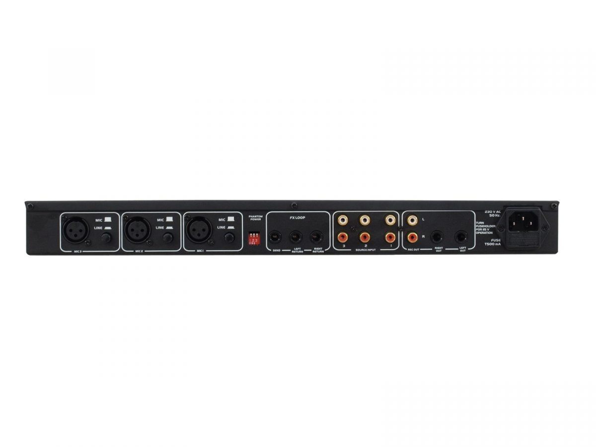 | Csatlakozások: | Bemenet: 3 x mikrofon / vonal 3 Pin XLR-en keresztül Bemenet: 3 x vonal sztereó RCA-n keresztül Bemenet: 2 x FX 6,3 mm-es jack foglalatba (mono) szerelhető változat Kimenet: 1 x rec. sztereó RCA-n keresztül Kimenet: 2 x master 6,3 mm-es jack foglalathoz (mono) szerelhető verzió | Csatornák : | Bemeneti csatorna: 3 x sztereó RCA-n keresztül, csatorna vezérlés forgatógombbal, 2 sávos hangvezérlés EQ 100Hz / 10kHz Microphon csatorna: 3 x monó Mic-line kapcsolóval XLR-n keresztül, csatornavezérlés potméterekkel Fő kimenet: 1 x sztereó a 6,3 mm / 3,5 mm-es csatlakozón keresztül (Jack), csatorna-vezérlés potméterekkel |