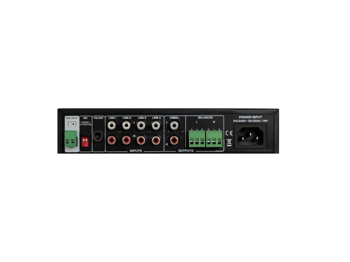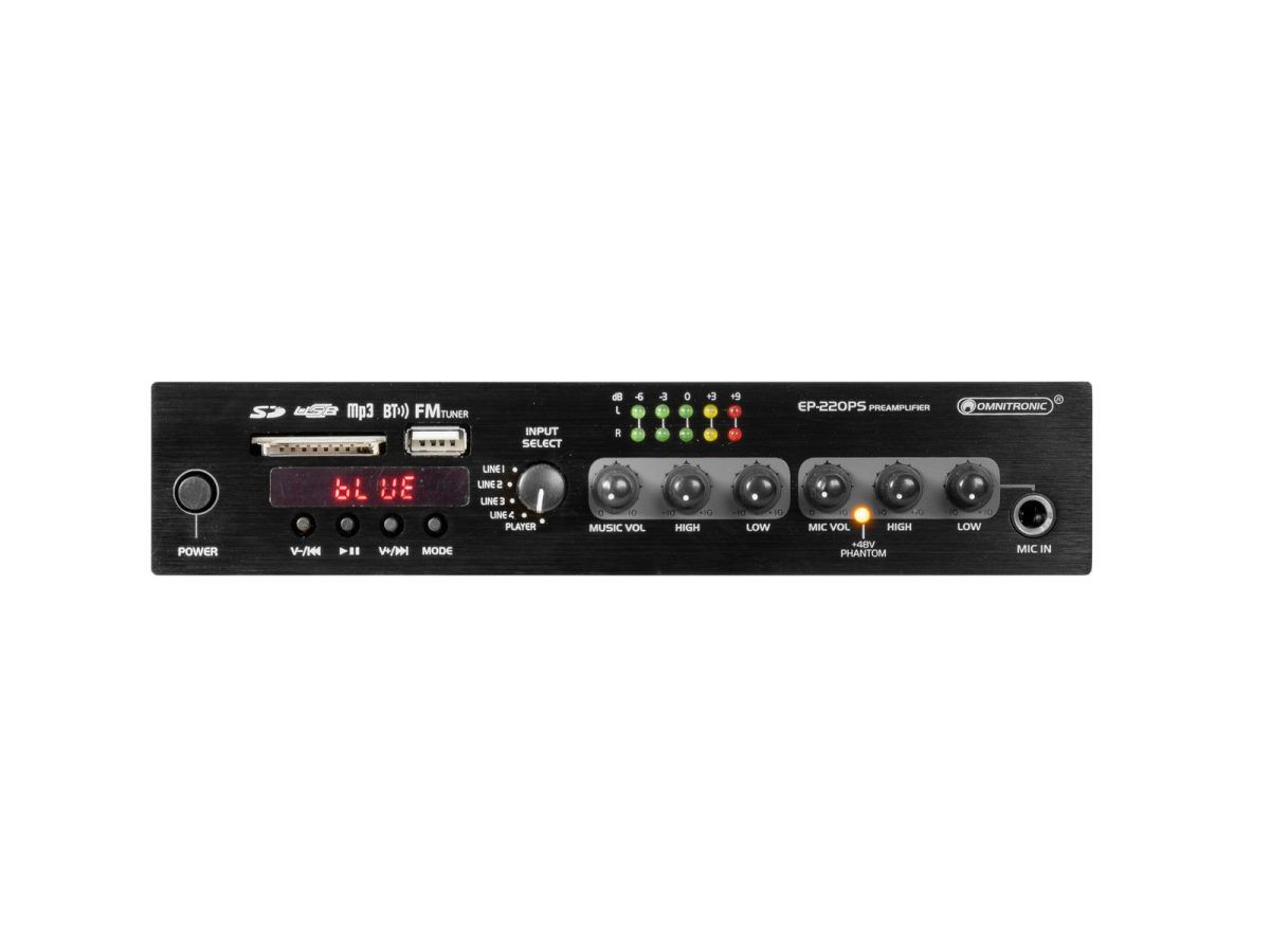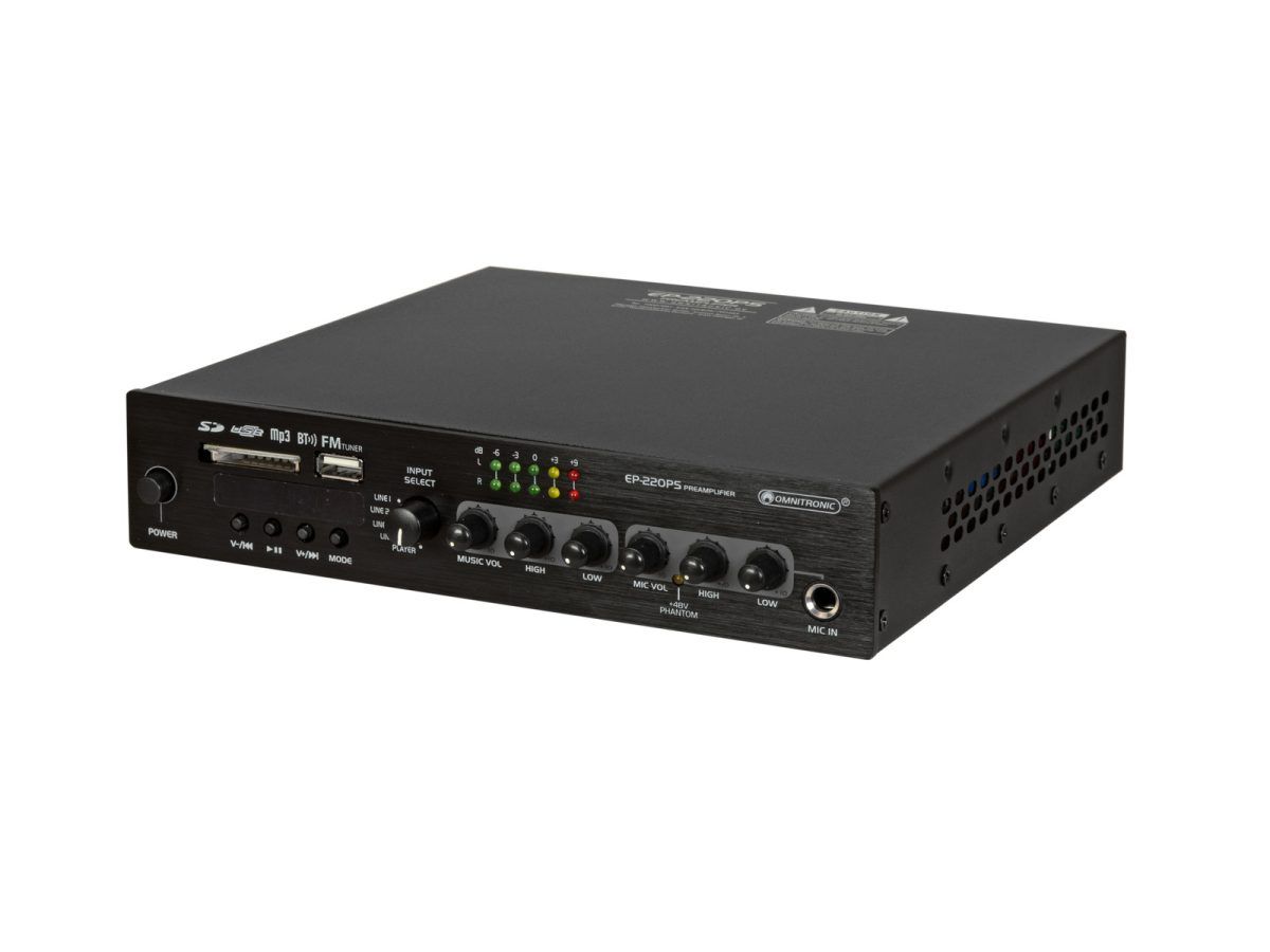 Az EP-220PS különösen alkalmas fix telepítésre éttermekben, edzõtermekben és kiskereskedelmi helyeken, ahol gyors hozzáférésû zenelejátszás-vezérlésre van szükség. Kétirányú hangszínszabályzóval rendelkezik, és négy bemenetet kínál vonaljelszintû audioegységekhez (pl. CD-lejátszó, tuner, keverõ). Streamelje zenéit vezeték nélkül okostelefonjáról, táblagépérõl vagy számítógépérõl Bluetooth-on keresztül a beépített audiolejátszóra, amely FM-tunert, valamint USB-tárolóeszközök és SD(HC) memóriakártyák számára is kínál. Az audiolejátszó kényelmes vezérléséhez egy távirányító is tartozik hozzá. A bemenetválasztón keresztül az egyik forrás kiválasztható lejátszáshoz. Az elõerõsítõ állítható mikrofonbemenettel is rendelkezik. A közlemény jobb érthetõsége érdekében aktiválható egy prioritási funkció. Különálló master kimeneteinek köszönhetõen az EP-220PS közvetlenül csatlakoztatható aktív hangszórókhoz vagy erõsítõkhöz.