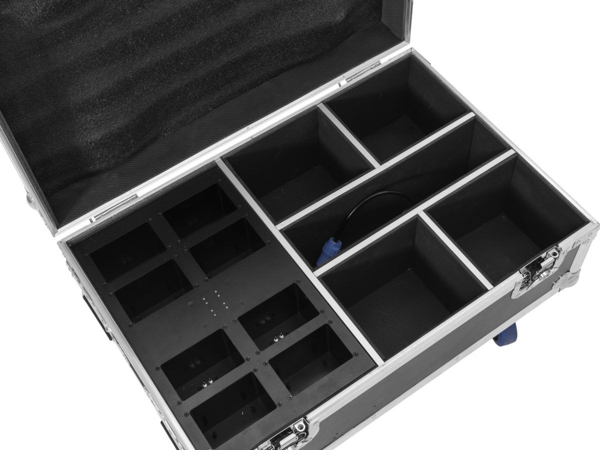 ROADINGER Flightcase 4x AKKU IP UP-4 Plus HCL Spot WDMX with Charging Function – PRO Szállítóláda 4 x Eurolite AKKU IP UP-4 Plus HCL Sot WDMX töltő funkcióval 8 akkumulátorhoz.