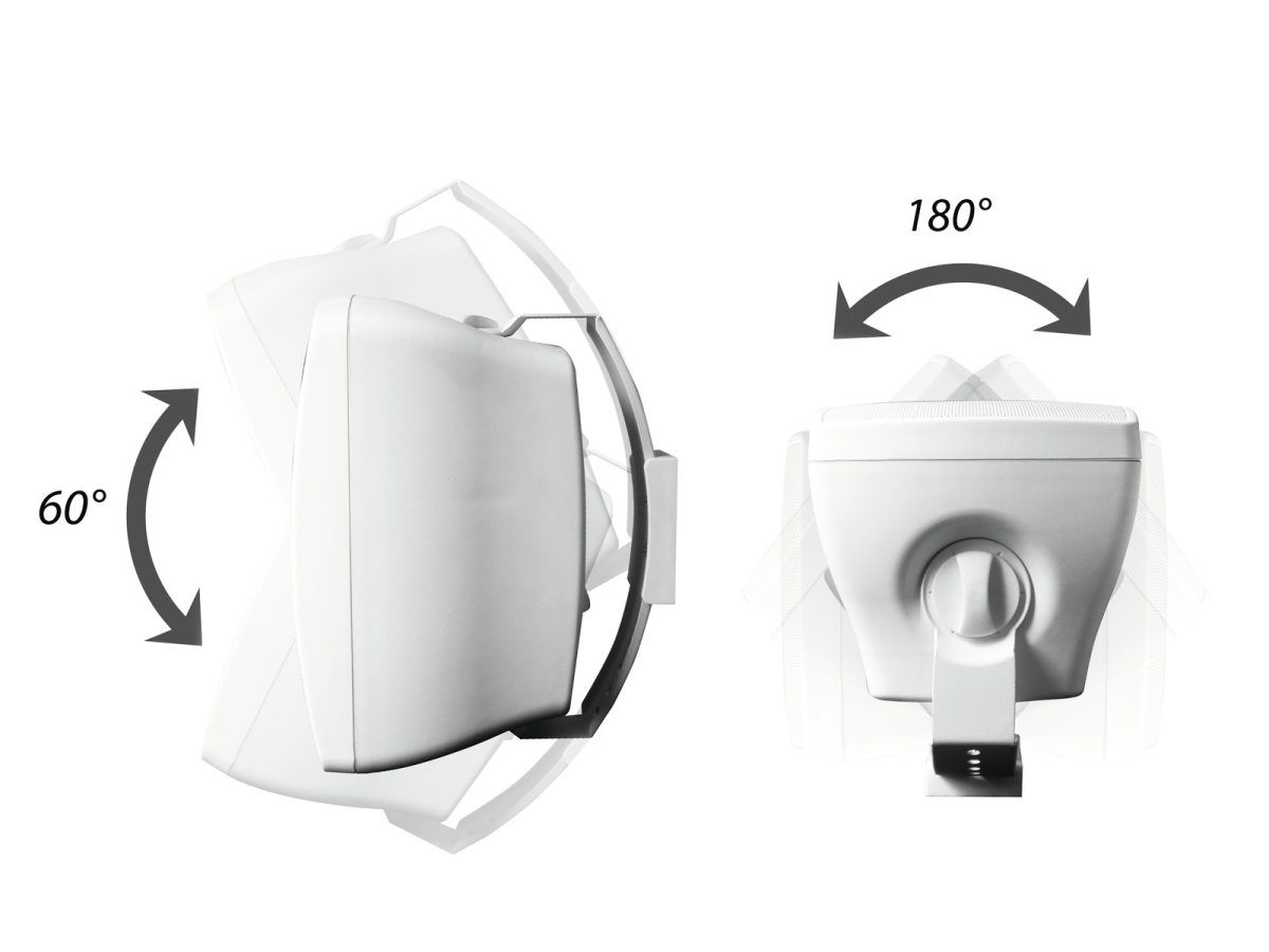 OMNITRONIC OD-5 Wall Speaker 8Ohms white 2x – Vízálló fali hangfalpár, fekete, 70W Az OMNITRONIC két időjárásálló hangszórója OD-5 kiváló hangminőséggel rendelkezik, és ideális beltéri és kültéri használatra. A kétirányú rendszer 13,5 cm-es mélynyomóval és 1,5 cm-es magassugárzóval műanyag házzal rendelkezik fém rácsokkal és fedelekkel a csatlakozások felett. Az elfordítható és dönthető rögzítőkonzol ideális bármilyen falon vagy falon történő rögzítéshez.