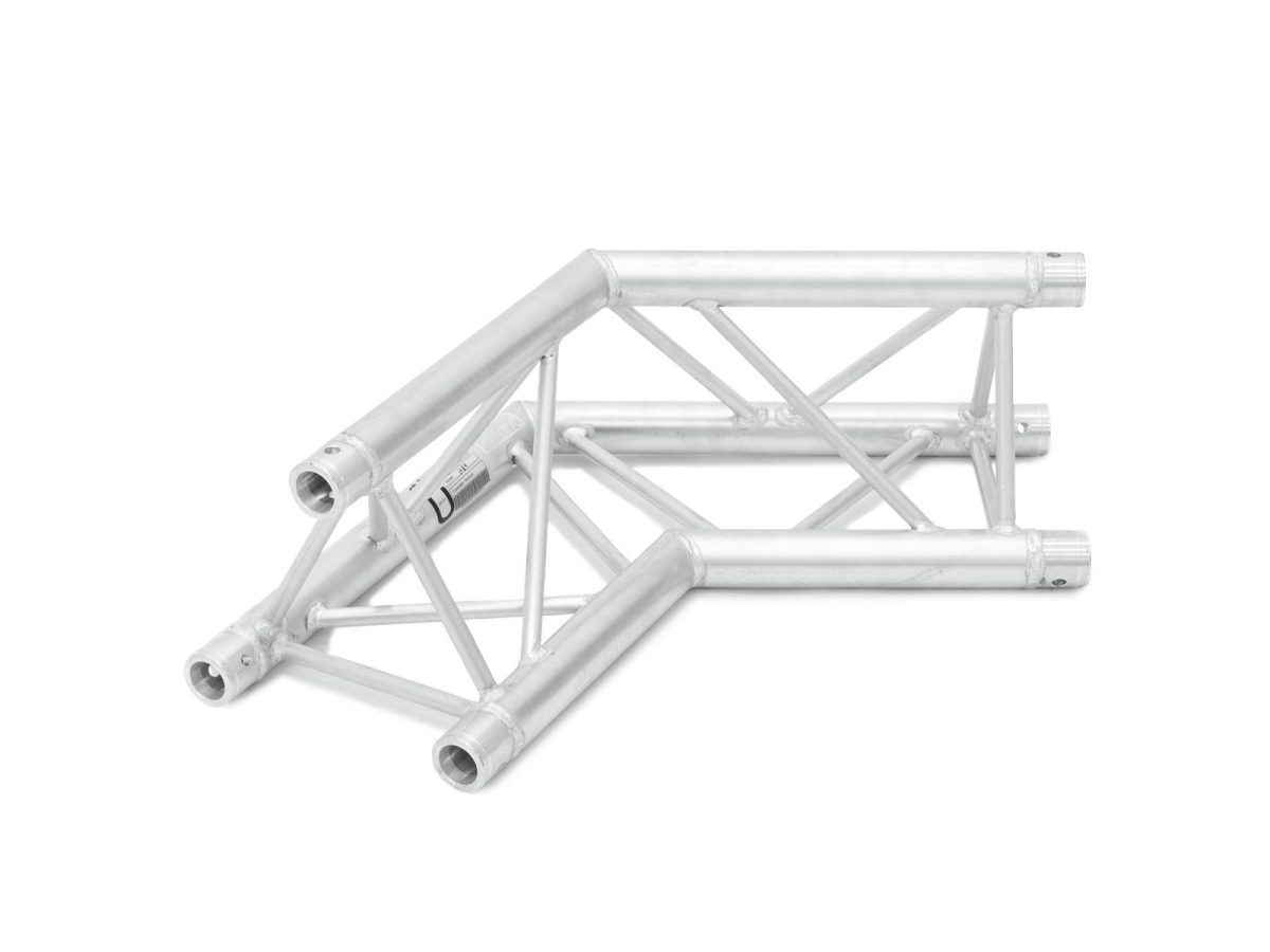 ALUTRUSS TRILOCK 6082AC-22 2-Way Corner 120° 3 pontos traverz rendszer sarokelem TRILOCK 6082 3 pontos traverz fényhíd rendszer A TRILOCK 6082 egy hárompontos traverz fényhíd rendszer alumíniumból. Az egyes elemek három kúpon, csatlakozókon és csatlakozókon keresztül vannak összekötve. A TRILOCK 6082 még nagyobb terhelésekhez EN-AW 6082 T6 (AlMgSi1 T6) ötvözetből készül. A kúpos összekötő elem csatlakozási rendszer előnye, hogy a kúpos összekötő elem összekötő elemek teljesen beleillenek a fő merevítő okba, így garantálva a legnagyobb teherbírást. A Quick-Lock rendszer gyors, hatékony és esztétikus összeszerelést tesz lehetővé, amikor a traverz tartó szerkezeteket gyakran összeszerelik és szétszerelik. A három fő merevítő 50 mm-es alumíniumcsőből készül, 2 mm-es falvastagsággal, és jó kapcsolatot kínál a szilárdság és a súly között. A merevítők átmérője 16 mm, 2 mm falvastagságuk, és elegendő fényt hagynak a csatlakozók, a kampók és a bilincsek felszereléséhez. A 290 és 257 mm külső méretekkel rendelkező TRILOCK QTTR stabil traverz fényhíd rendszer nagyobb terhelések és hosszabb tartósság érdekében. Ezt a rendszert elsősorban intenzív használatra tervezték színpadi installációkban, vásári installációkban, rendezvény-installációkban, de fix diszkókban és színházakban is. Csiszolt felülete miatt ez az univerzális rendszer igazi figyelemfelkeltő. A szabványos rendszerhosszak, sarkok, körök és tartozékok széles skálája miatt ez a rendszer rendkívül sokoldalú és korlátlan tervezési lehetőségeket kínál. Ennek a traverz fényhíd rendszer nek a gyártását TUV-felügyelet alatt tartják. A terhelési táblázat mint számítási foglalat a termék megvásárlása előtt letölthető az internetről! Kérjük, vegye figyelembe: ezt a traverz fényhíd rendszer t soha nem szabad kombinálni más rendszerekkel!