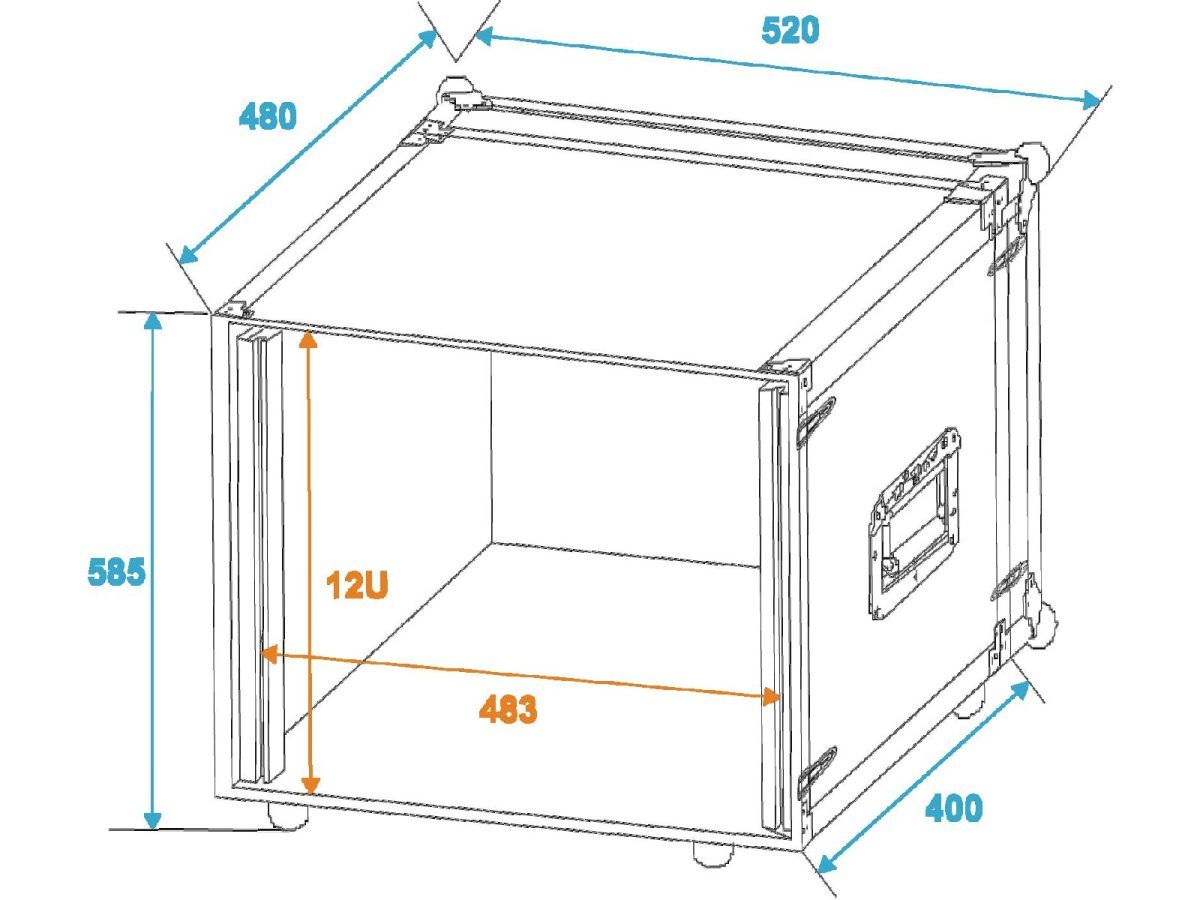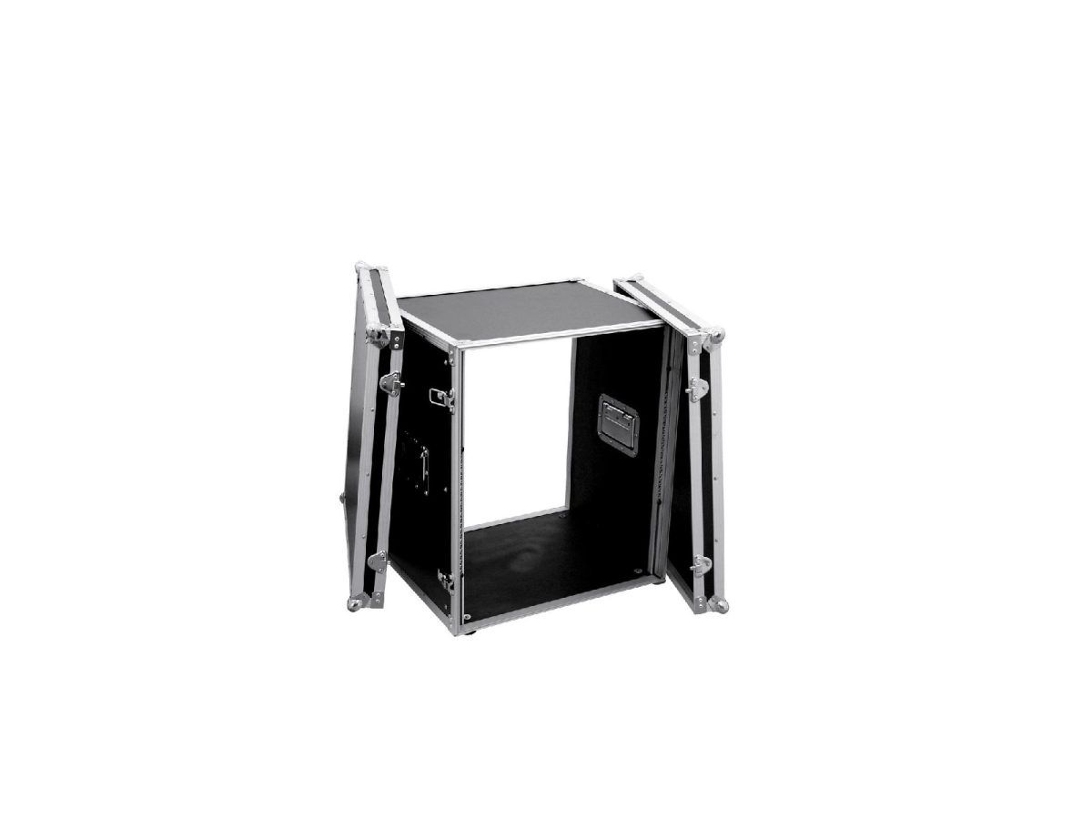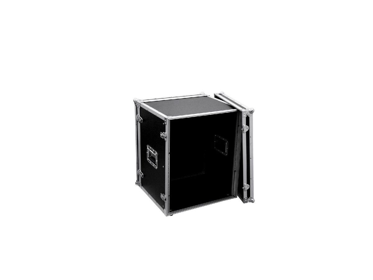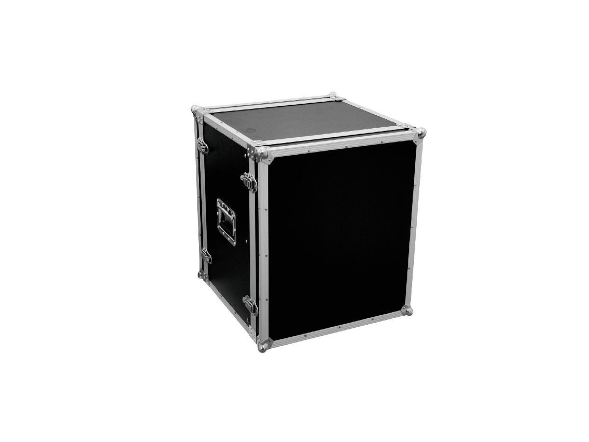 Flightcase for 483 mm devices (19″)Transport your control and effect units with a width of 483mm or 19″ with the ROADINGER effect rack. The flight case is stable and of high quality, making it ideal for mobile use and the stage. The 6 mm thick walls, the aluminium profile frame with rounded corners and the three-legged, medium-sized steel ball corners give the case its stability. The two lids of the case are removable (double door version). The effect rack is also equipped with eight snap locks with eyelets for locking and two chrome-plated case folding handles. The four large, steel-reinforced rubber feet provide the necessary stability. The maximum load is 25 kg.
