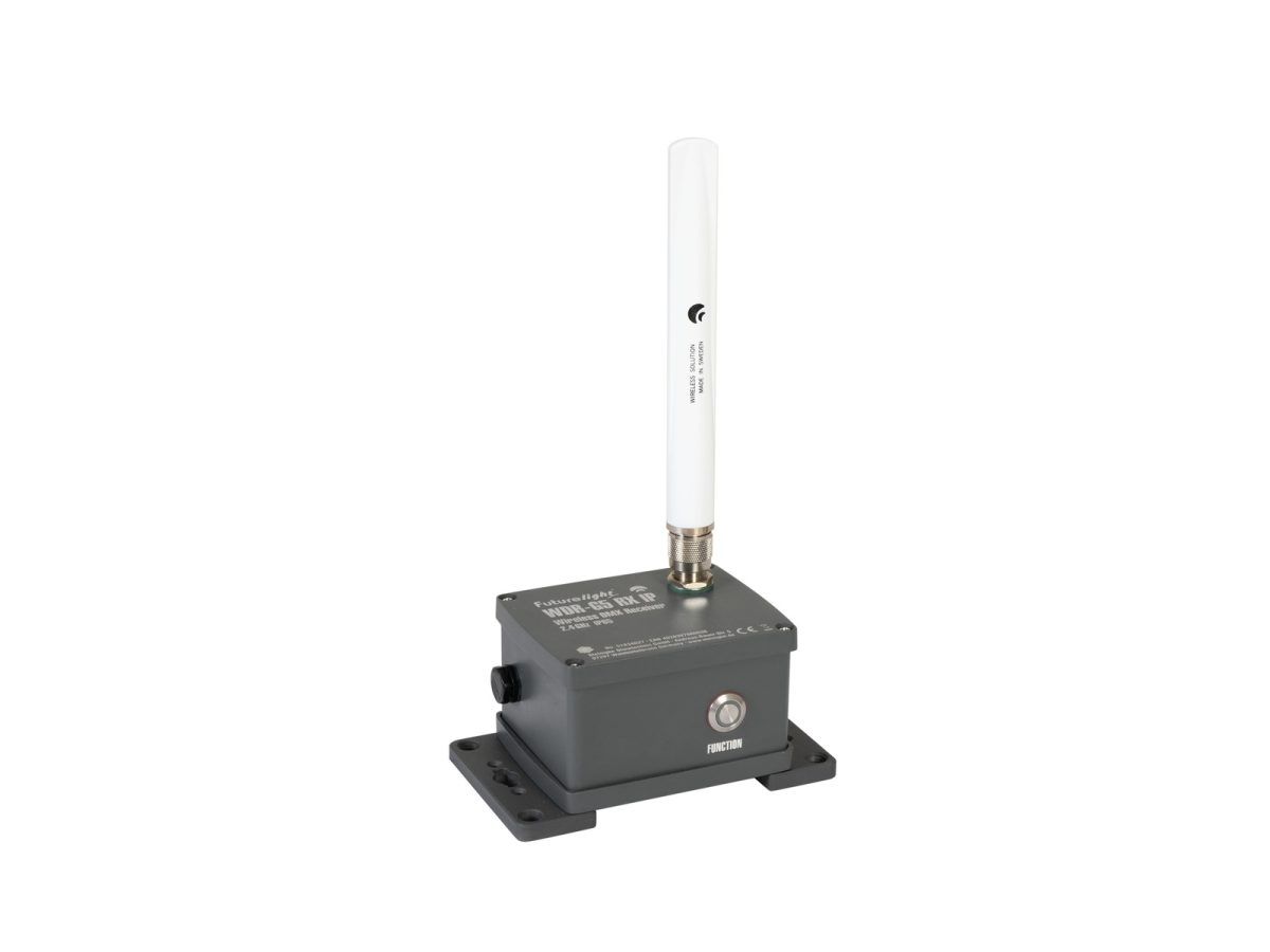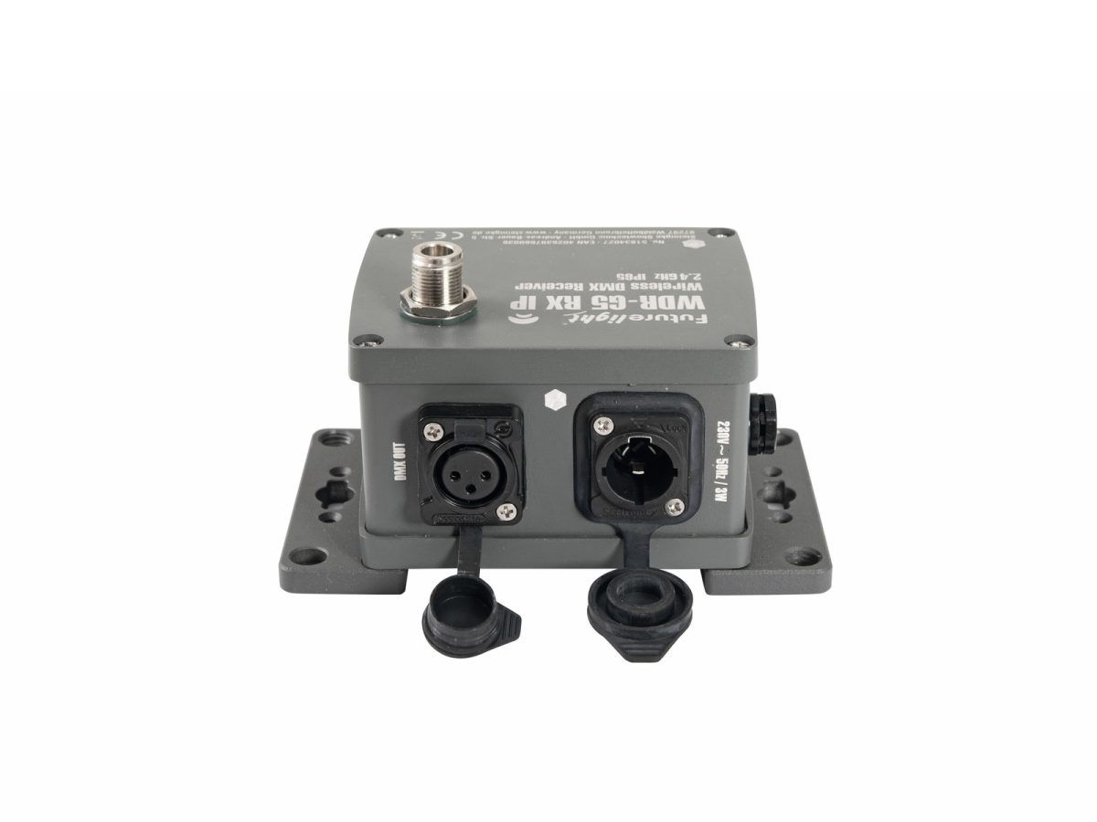 FUTURELIGHT WDR-G5 RX IP Wireless DMX Receiver Outdoor – Vezeték nélküli DMX vevő kültéri Időjárásálló vezeték nélküli DMX vevő vezeték nélküli megoldással, IP65 A FUTURELIGHT WDR-G5 időjárásálló DMX rádióvevőjével 512 DMX csatorna vezeték nélküli vevőjével rendelkezik, amely lehetővé teszi, hogy szinte az összes készülékét vezeték nélkül működtesse DMX vezérléssel. A beépített G5 vevőegységnek köszönhetően A Wireless Solutions antennája hosszabb távolságokat képes áthidalni és bosszantó kábeleket hagy ki. A WDR-G5 kiválóan alkalmas nagyobb színpadokon vagy eseményeken való használatra. Az integrált AFHSS technológia interferenciamentes jelátvitelt biztosít a 2,4 GHz-es szakaszon , regisztráció és díjmentes az egész világon. Az időjárásálló, öntött alumínium ház (IP65) szerelőszalagokkal van felszerelve. A hálózati csatlakozás zárható bemeneti csatlakozójának köszönhetően, amely zárt állapotban szinte minden időjárási viszonyoknak ellenáll, a WDR-G5 szabadtéri fesztiválokra is használható. A DMX rádióvevő hatótávolsága vizuális érintkezés mellett 500 m. A Plug-nak köszönhetően egyszerű és gyors, csak egy gombbal indítható & Játék. Az integrált LED lehetővé teszi az üzemállapot könnyű figyelemmel kísérését.